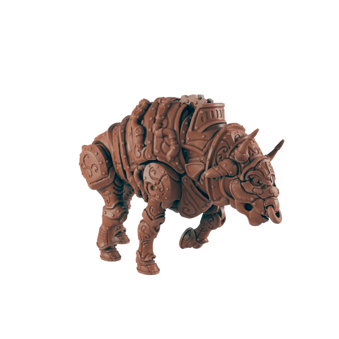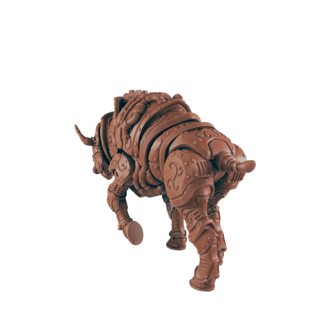 Built to haul the empire’s burdens, the Clockwork Oxen is a marvel of industrial strength. Its frame is forged from riveted iron plates, each movement powered by the steady churn of pistons and steam vents along its flanks. Brass horns gleam beneath layers of soot, and its eyes glow faintly with alchemical fire—unyielding, tireless, and unfeeling. Once beasts of field and farm, these mechanical titans now drag carriages through cobblestone streets, tow artillery across battlefields, and labor in the mines where no living creature could survive. Their heavy steps echo like war drums, each strike of hoof on stone a reminder of industry’s relentless march.