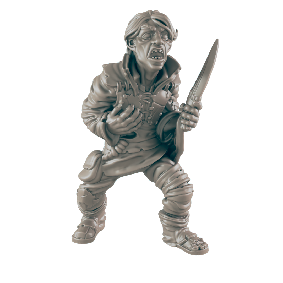 This resin 3D printed miniature captures the sly essence of the cutpurse: one hand outstretched in mid-swipe, the other resting on a hidden blade, cloak drawn close to blend with the crowd. Perfect as a petty thief, recurring nuisance, or reluctant informant, the cutpurse is a versatile addition to any campaign where cities seethe with secrets.