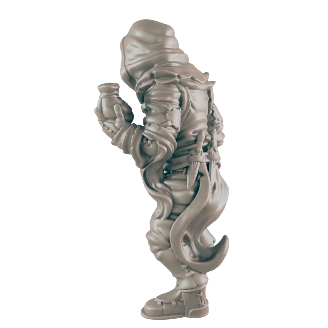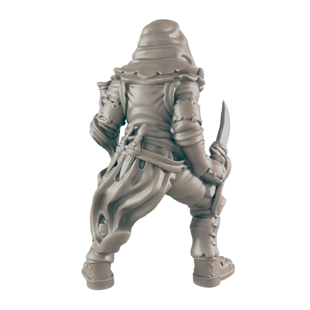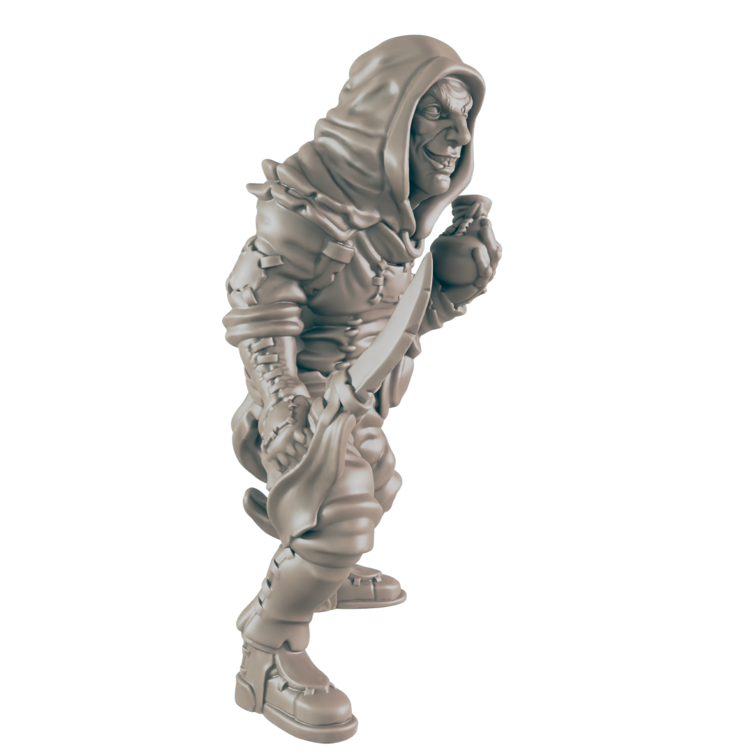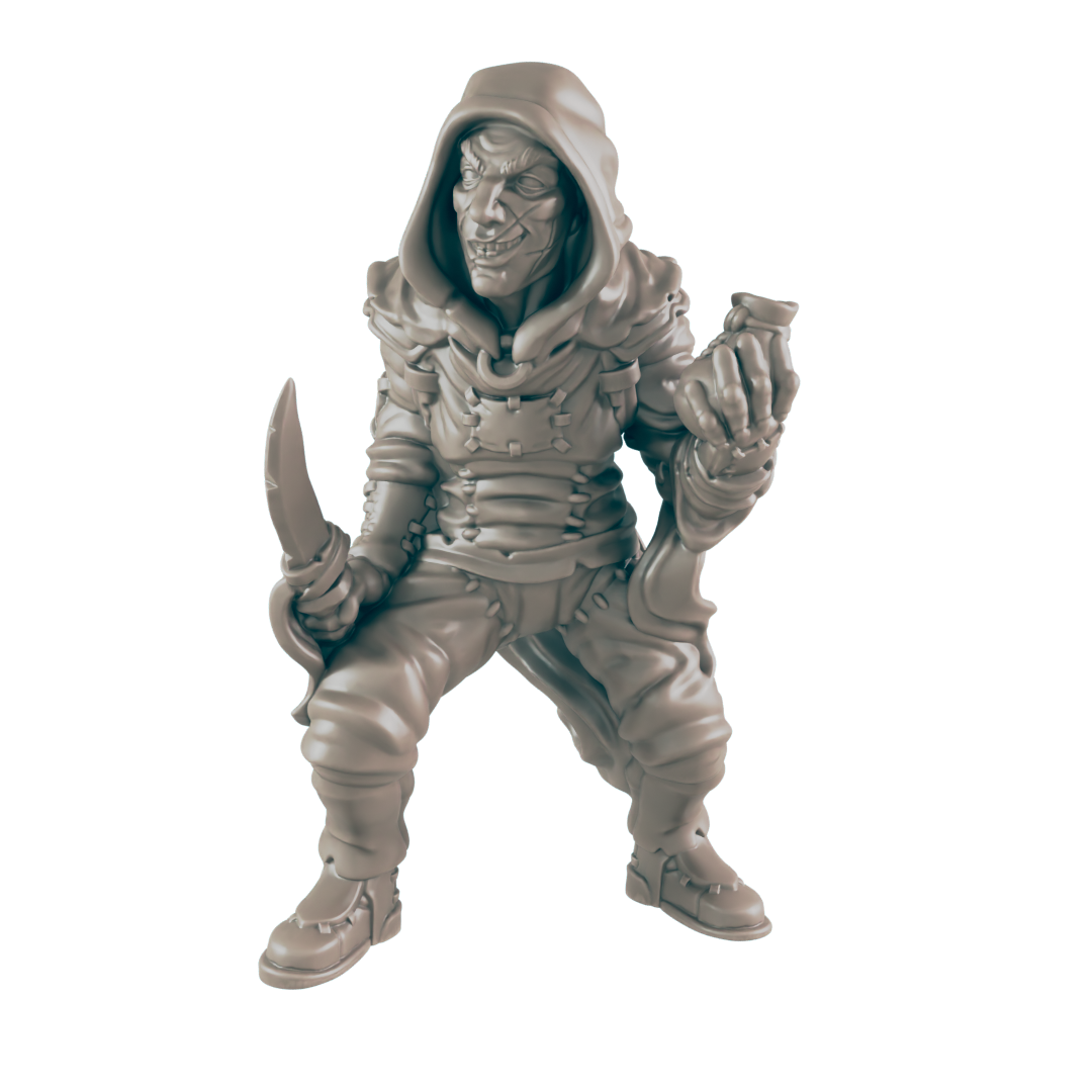 This resin 3D printed miniature captures the menace of the cutthroat in vivid detail—dagger drawn, stance low and ready to strike, with a face set in grim determination. Perfect as a city rogue, assassin, or recurring rival, this model is a versatile addition to any campaign where intrigue and betrayal linger in the shadows.
