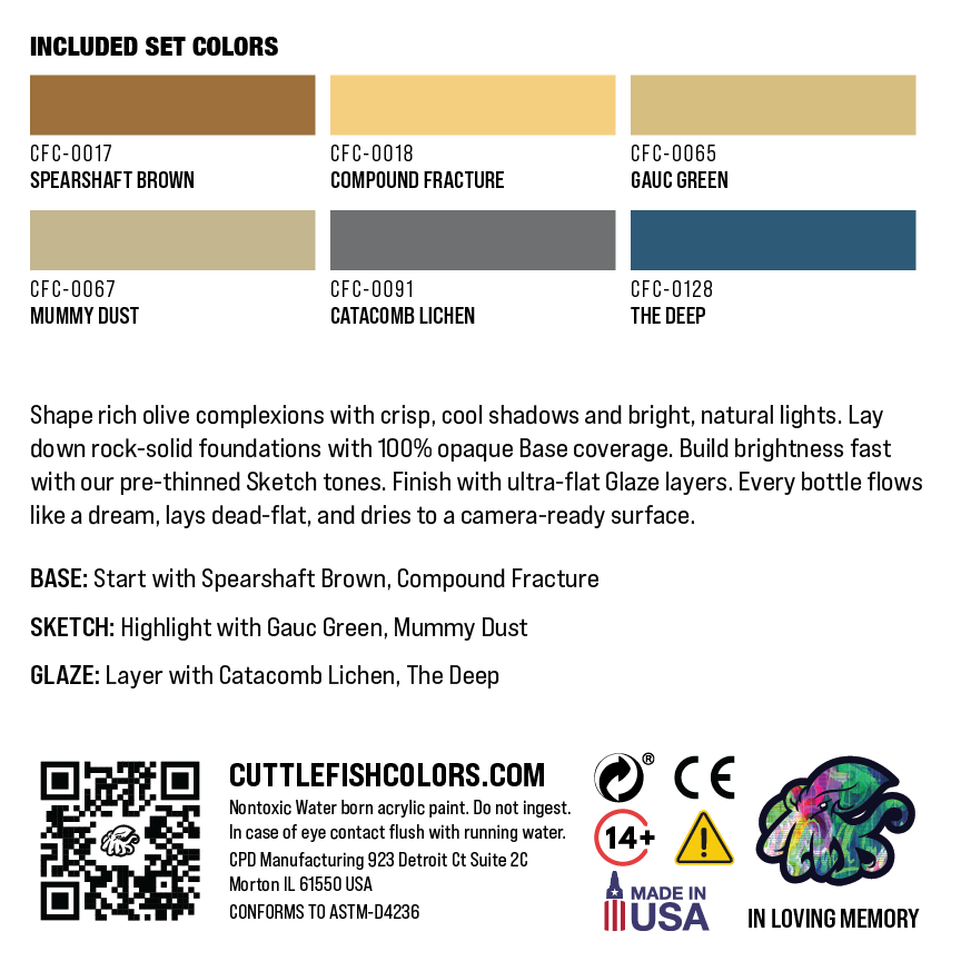 Cool-toned olive depth with crisp, readable highlights. Fleshcraft: Olive & Mediterranean gives you a guided 2/2/2 workflow to build medium–deep olive complexions that look natural under tabletop lighting and in photos—fast, repeatable, ultra-flat.