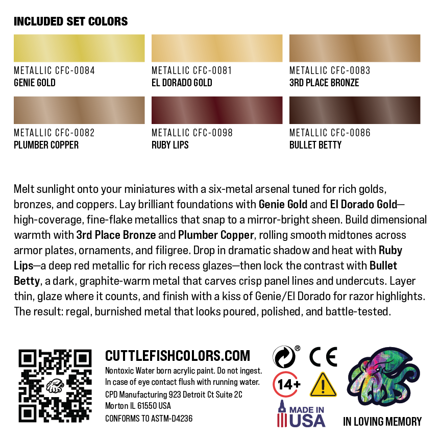 Pour on radiant warmth with a curated ramp of golds, bronzes, and coppers. Forgefire Metals: Warm Alloys delivers six fine-flake metallics that layer smoothly, keep their sparkle through blends and glazes, and finish with sharp, readable highlights—perfect for relic trim, filigree, plate, and arcane ornaments.