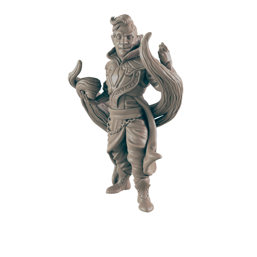 Haunted eyes and a confident smile—this pact-bound spellcaster walks the thin line between brilliance and damnation. His every word hums with borrowed power, and every favor comes due.
