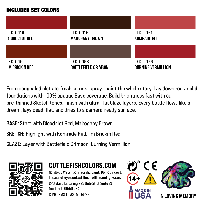From congealed clots to fresh arterial spray, Hemocraft is a surgical palette for realistic wounds, splatter, and story-driven weathering. Build depth fast, control saturation, and finish ultra-flat so the detail stays readable under any light.