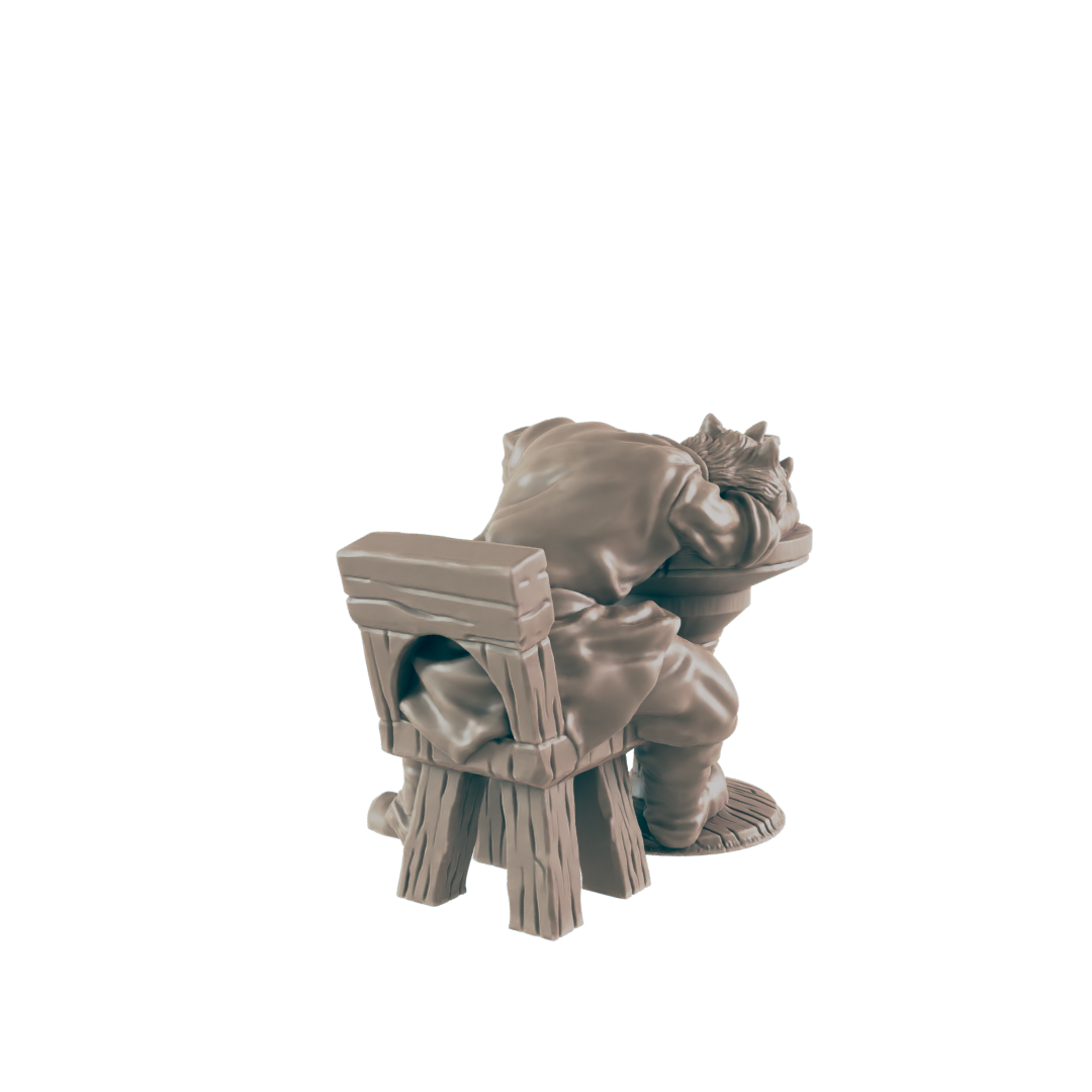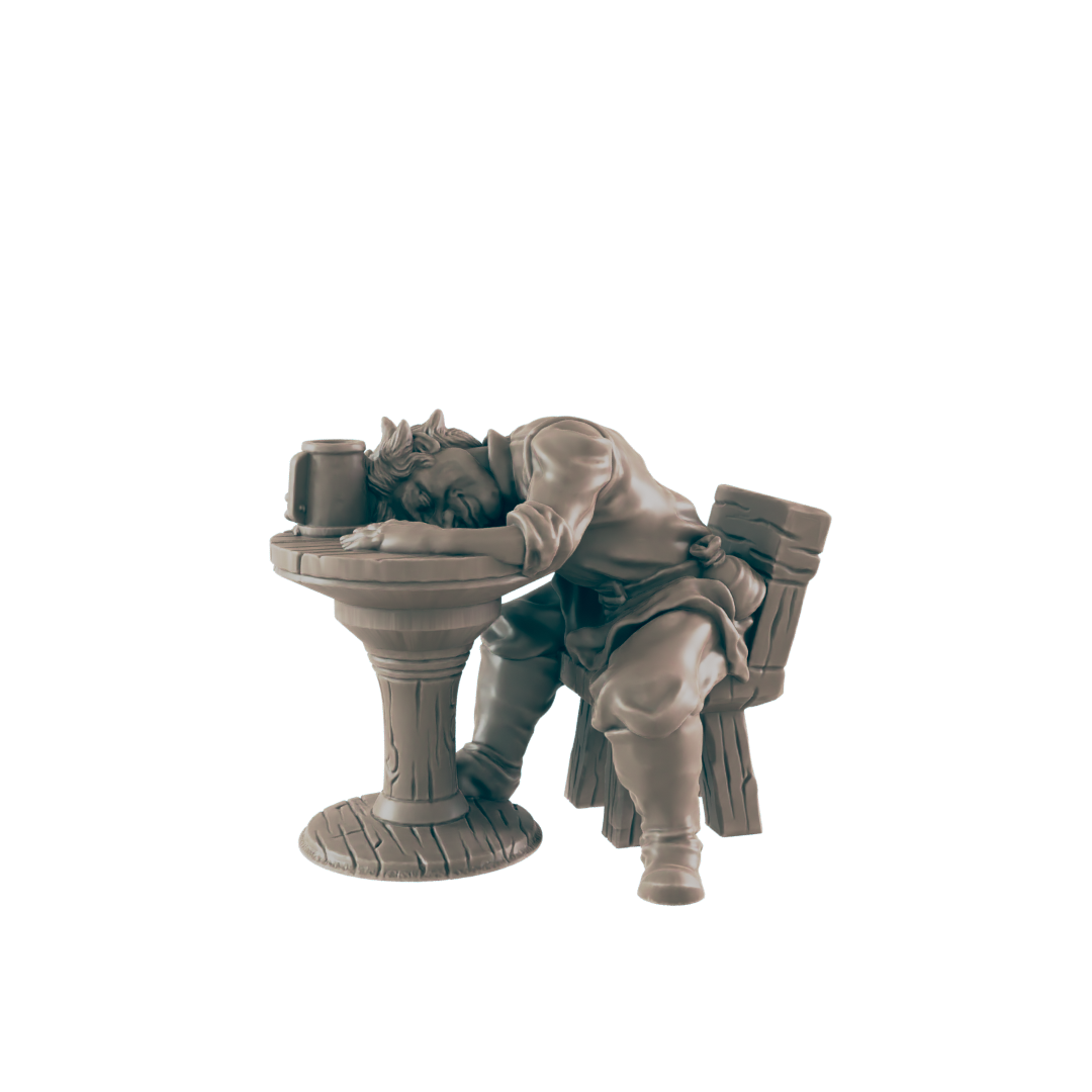 Snoring loudly, this poor soul has made the tavern table both pillow and confessional. Between hiccups, they mumble tales of lost loves, lost fortunes, and possibly a lost treasure.