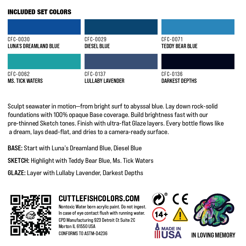 Base broad areas with Luna’s Dreamland Blue for open water; drop Diesel Blue into lower planes and hull-shadow.