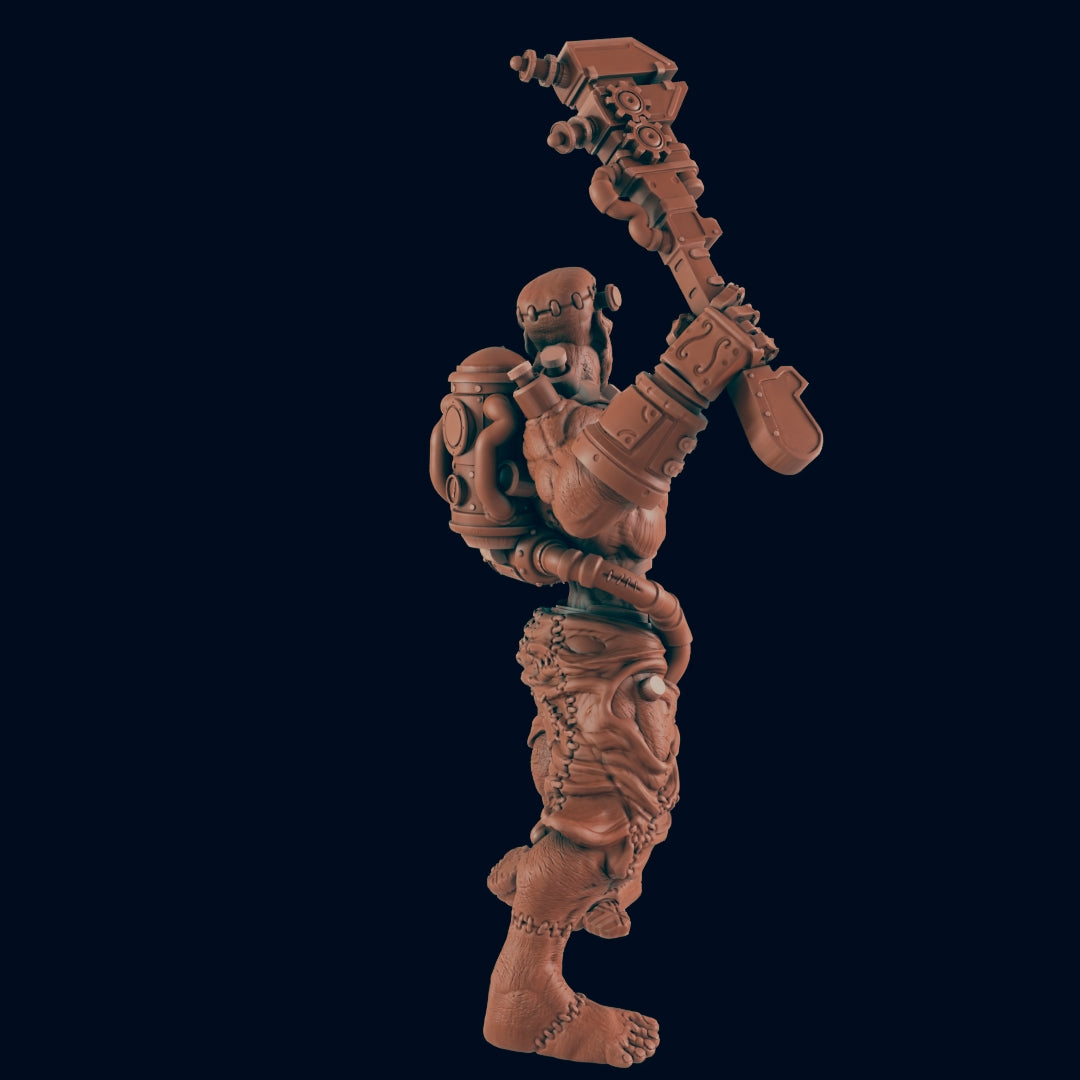 A towering figure of stitched flesh and iron rivets, The Monster lumbers forth as the grim legacy of forbidden science. Bolts and plates bind sinew to steel, while alchemical fluids pulse through glass tubes that jut from its neck and arms. Its eyes, pale and sorrowful, betray the spark of humanity buried beneath a body built for destruction. Cloaked in scraps of cloth and shackled by its own unnatural design, this creation is both victim and threat—an echo of genius unchained, and a reminder of the price progress demands. When it moves, the air is heavy with the scent of smoke, blood, and regret.