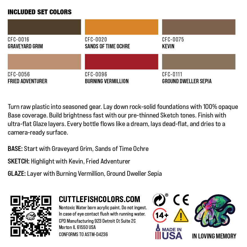 From well-oiled saddles to trail-worn scabbards, Wood & Leather is a warm, practical palette tuned for furniture grain, straps, boots, bows, and aged timber. Layer fast, blend cleanly, and finish dead-flat for rugged, readable surfaces.